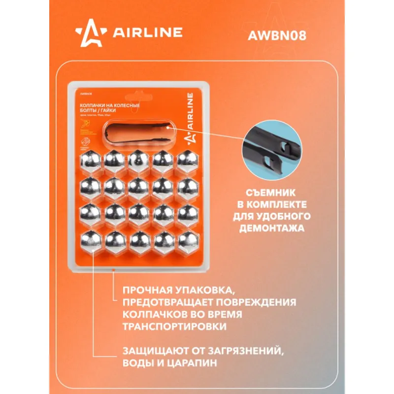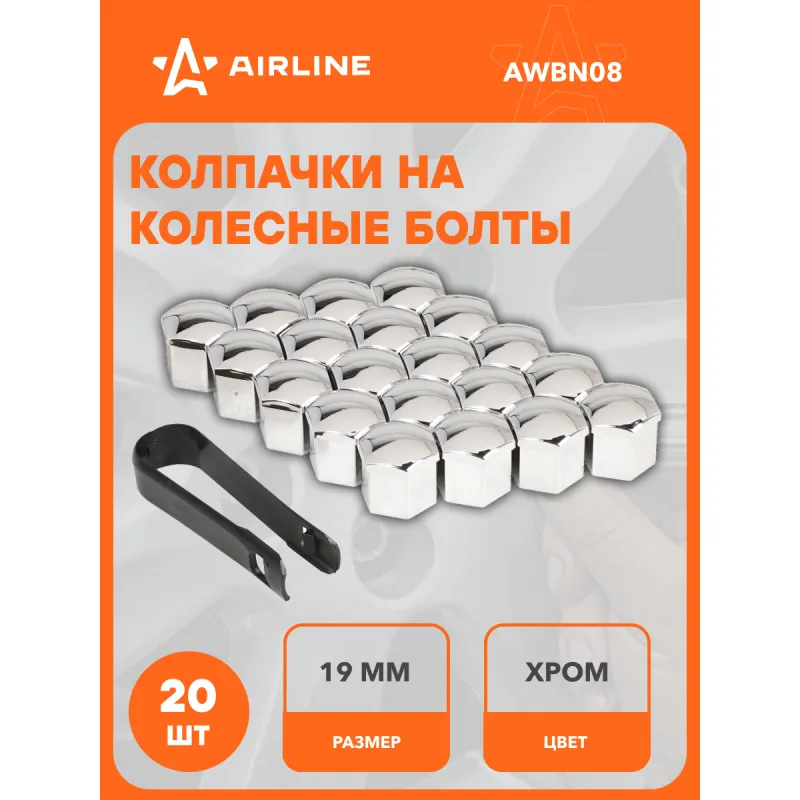Колпачки на колесные болты/гайки 19 мм, хром, пластик, 20 шт.+ съёмник Описание: Колпачки на колесные болты или гайки AIRLINE AWBN08, которые упакованы в наборы по 20 шт. со специальным съемником для облегчения демонтажа. Изготовлены из ударопрочного пластика. Цвет: хром. В линейке AIRLINE вы найдете три типа размера колпачков на колесные болты - 17,19,21 мм. Размер колпачков AIRLINE AWBN08 - 19 мм. Колпачки устанавливаются сверху колесных болтов/гаек и служат для защиты колесного крепежа от внешнего воздействия агрессивной среды, сокрытия дефектов, а также являются отличным дополнением к внешнему тюнингу автомобиля. Преимущества: - Ударопрочный материал; - Зажим для съема в комплекте; - Стильный дизайн; - Защита колесного крепежа; - Прочная упаковка, предотвращает повреждения колпачков во время транспортировки. Колпачки на колесные болты служат не только для защиты, но и помогут украсить вашу машину, поэтому станет приятным подарком мужу, папе, бату, дяде, жене, маме, сестре, тете, коллеге. Этот аксессуар для машины - это универсальный подарок на любой праздник. В линейке AIRLINE, вы найдете широкий ассортимент высококачественных автотоваров и средств по уходу за вашим автомобилем, колпачки на шинный вентиль, колпачки на колесные болты гайки, съемник для колпачков, аксессуары для велосипедов, все для тюнинга, колпаки на автомобиль, светящиеся колпачки на колеса, аксессуары для мотоциклов, колясок. Мы гарантируем качество и надежность наших товаров. Характеристики: Артикул: AWBN08 Цвет: хром Размер гайки, мм: 19 Комплектация: Колпачки - 20 шт Съемник - 1 шт Блистер - 1 шт Гарантия: от 1 года.