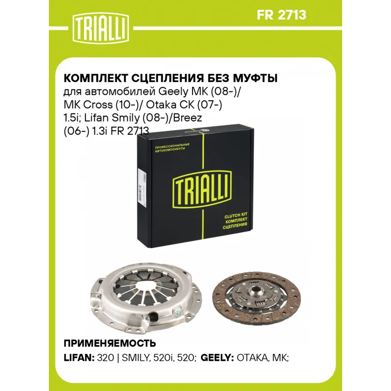 Комплект сцепления без муфты для автомобилей Geely MK (08-)/ MK Cross (10-)/ Оtaka CK (07-) 1.5i; Lifan Smily (08-)/Breez (06-) 1.3i Характеристики: Артикул: FR 2713 OEM номера: LF479Q11601200A, LF479Q11601100A, 1086001145, 1086001146, 1016003999 Профиль ступицы: 19.11 x 22 Число зубцов, шт.: 20 Диаметр, мм: 190 Гарантийный срок: 2 года/60 000 км Сопутствующий товар: Комплекты сцепления: FR 2705 Количество на автомобиль: 1 Товарная линейка: BLACK Комплектация: Диск сцепления ведомый - 1 шт Диск сцепления нажимной - 1 шт Гарантия: от 1 года.