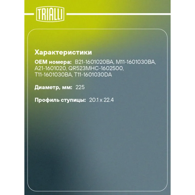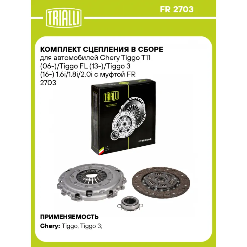 Комплект сцепления в сборе для автомобилей Chery Tiggo T11 (06-)/Tiggo FL (13-)/Tiggo 3 (16-) 1.6i/1.8i/2.0i с муфтой Характеристики: Артикул: FR 2703 OEM номера: B21-1601020BA, M11-1601030BA, A21-1601020, QR523MHC-1602500, T11-1601030BA, T11-1601030DA Гарантийный срок: 2 года/60 000 км Количество на автомобиль: 1 Диаметр, мм: 225 Число зубцов, шт.: 20 Профиль ступицы: 20.1 x 22.4 Тип двигателя: 481F/484F/E4G16 Товарная линейка: BLACK Подходит для авто: Chery Tiggo (T11) (06-), Tiggo (FL) (13-), Tiggo (FL) (13-), Tiggo 3 (16-) Для проверки применяемости отправьте VIN автомобиля через вкладку "Есть вопросы о товаре?" Комплектация: Диск сцепления ведомый - 1 шт Диск сцепления нажимной - 1 шт Муфта выключения сцепления в сборе - 1 шт Гарантия: от 1 года.
