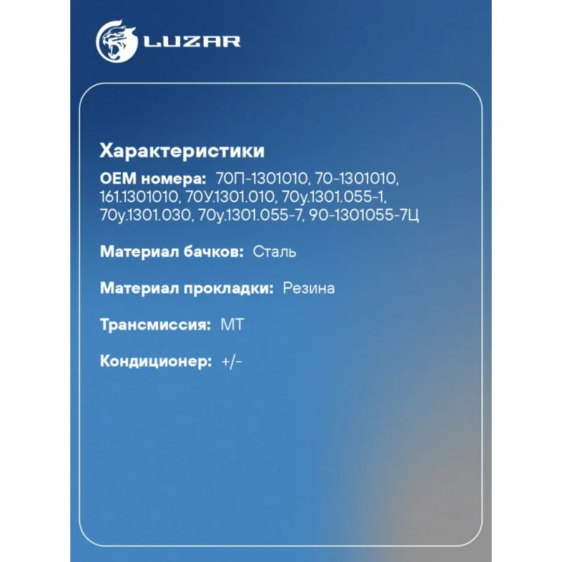 Бачок радиатора охлаждения для тракторов МТЗ-80/82 (верхний, с прокладкой) Характеристики: Артикул: LC 0680 OEM номера: 70П-1301010, 70-1301010, 161.1301010, 70У.1301.010, 70у.1301.055-1, 70у.1301.030, 70у.1301.055-7, 90-1301055-7Ц Габаритные размеры: 485*89*150 Материал бачков: сталь Материал прокладки: резина Трансмиссия: MT Кондиционер: +/- Подходит для авто: MTZ 80, 82 КТЗ Т-70 ПТЗ Т-90 Для проверки применяемости отправьте VIN автомобиля через вкладку "Есть вопросы о товаре?" Комплектация: Паспорт изделия Прокладка резиновая - 1 шт Бачок радиатора стальной - 1 шт Гарантия: от 1 года.