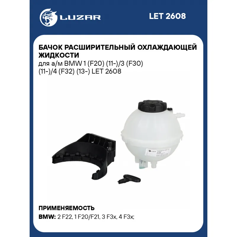 Бачок расширительный охлаждающей жидкости для а/м BMW 1 (F20) (11-)/3 (F30) (11-)/4 (F32) (13-) Характеристики: Артикул: LET 2608 OEM номера: 17137642158, 17137609469, 7609469, 7642158 Трансмиссия: MT/AT Кондиционер: +/- Габариты изделия, мм: 196,9*192,4*203,6 Сопутствующий товар: Радиаторы охлаждения: LRc 26111 Количество на автомобиль: 1 Материал бачков: пластик Комплектация:: с крышкой Подходит для авто: BMW 2 F22 (13-), 1 F20/F21 (11-), 1 F20/F21 (11-), 3 F3x (11-), 3 F3x (11-), 4 F3x (13-) Для проверки применяемости отправьте VIN автомобиля через вкладку "Есть вопросы о товаре?" Комплектация: Бачок расширительный - 1 шт Паспорт изделия - 1 шт Крышка расширительного бачка - 1 шт Гарантия: от 1 года.