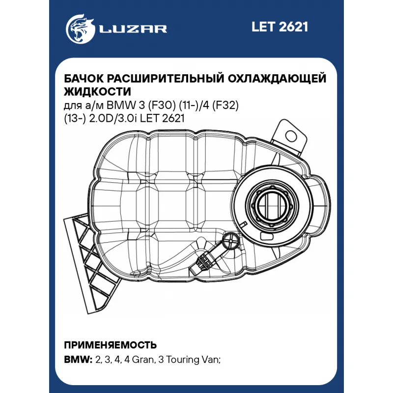 Бачок расширительный охлаждающей жидкости для а/м BMW 3 (F30) (11-)/4 (F32) (13-) 2.0D/3.0i Характеристики: Артикул: LET 2621 OEM номера: 17137642160, 17137609468 Трансмиссия: MT/AT Кондиционер: +/- Габариты изделия, мм: 283*206*172 Сопутствующий товар: Радиаторы охлаждения: LRc 26111; LRc 2613 Сопутствующий товар: Крышки (пробки) расширительного бачка: LL 2604 Количество на автомобиль: 1 Материал бачков: пластик Комплектация: с крышкой Комплектация: Бачок расширительный - 1 шт Паспорт изделия - 1 шт Крышка расширительного бачка - 1 шт Гарантия: от 1 года.
