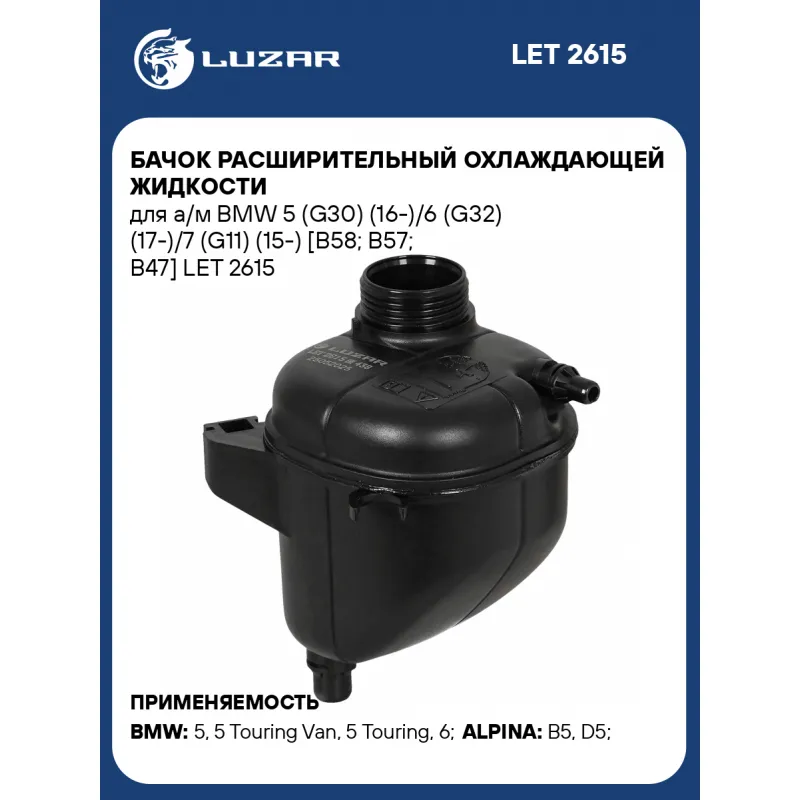 Бачок расширительный охлаждающей жидкости для а/м BMW 5 (G30) (16-)/6 (G32) (17-)/7 (G11) (15-) [B58; B57; B47] Характеристики: Артикул: LET 2615 OEM номера: 17138610655, 17139485733 Трансмиссия: MT/AT Кондиционер: +/- Габариты изделия, мм: 178,8*131,7 Количество на автомобиль: 1 Материал бачков: пластик Примечание: комплектуется силикагелем Комплектация: Бачок расширительный - 1 шт Паспорт изделия - 1 шт Гарантия: от 1 года.