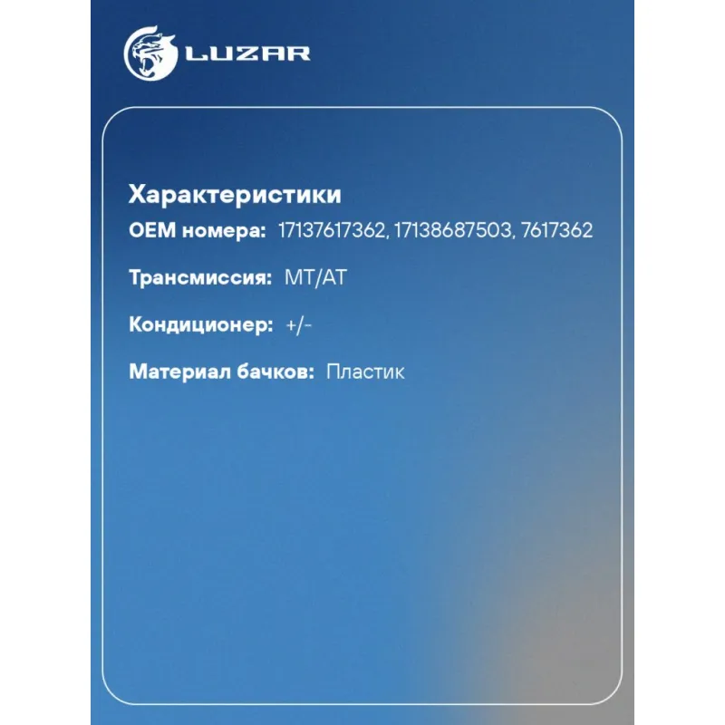 Бачок расширительный охлаждающей жидкости для а/м BMW X1 (F48) (15-)/X2 (F39) (17-)/2 (F44) (19-) Характеристики: Артикул: LET 2618 OEM номера: 17137617362, 17138687503, 7617362 Трансмиссия: MT/AT Кондиционер: +/- Габариты изделия, мм: 269,2*243,8*146,5 Сопутствующий товар: Радиаторы охлаждения: LRc 2630 Сопутствующий товар: Крышки (пробки) расширительного бачка: LL 2020 Количество на автомобиль: 1 Материал бачков: пластик Комплектация: Бачок расширительный - 1 шт Паспорт изделия - 1 шт Гарантия: от 1 года.