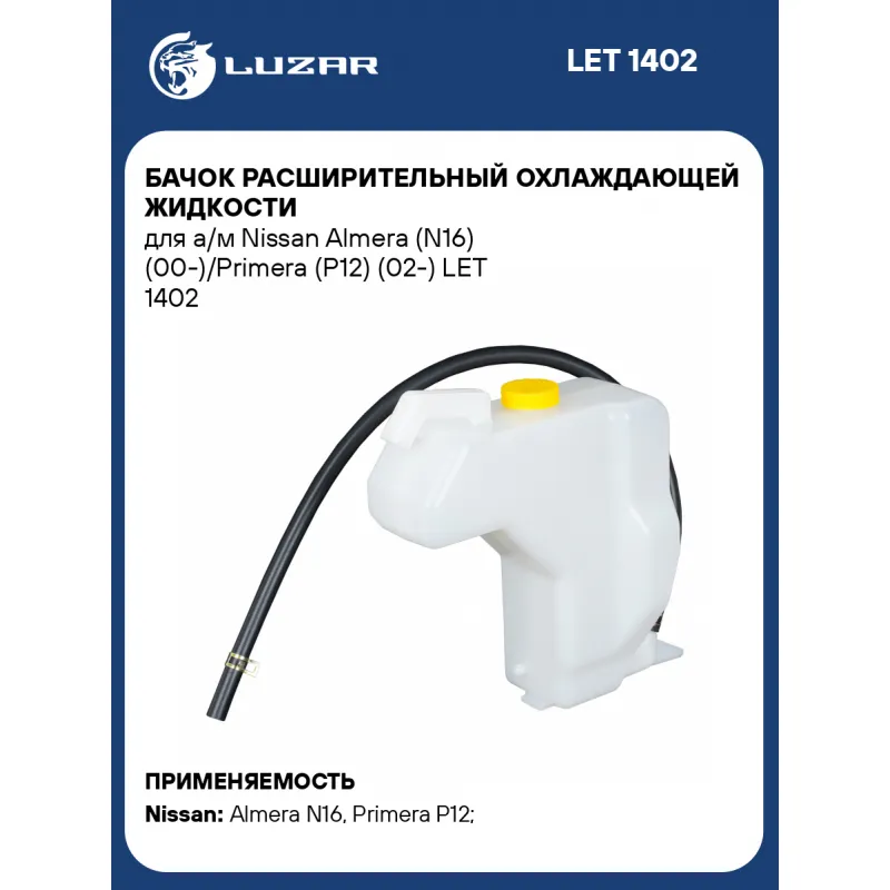 Бачок расширительный охлаждающей жидкости для а/м Nissan Almera (N16) (00-)/Primera (P12) (02-) Характеристики: Артикул: LET 1402 OEM номера: 21710BM410, 21710BM400 Трансмиссия: MT/AT Кондиционер: +/- Габариты изделия, мм: 240,2*220*94,2 Сопутствующий товар: Радиаторы охлаждения: LRc 14BM; LRc 141BM; LRc 14111 Сопутствующий товар: Крышки (пробки) расширительного бачка: LL 1415 Количество на автомобиль: 1 Материал бачков: пластик Комплектация:: с крышкой Подходит для авто: Nissan Almera N16 (00-), Primera P12 (02-), Almera N16 (00-), Primera P12 (02-) Для проверки применяемости отправьте VIN автомобиля через вкладку "Есть вопросы о товаре?" Комплектация: Бачок расширительный - 1 шт Паспорт изделия - 1 шт Гарантия: от 1 года.