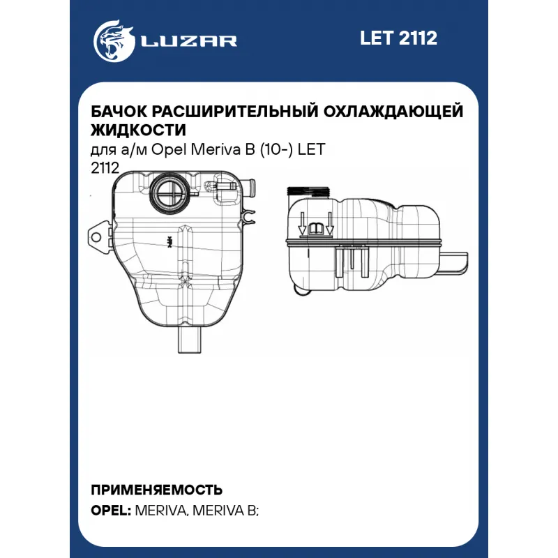 Бачок расширительный охлаждающей жидкости для а/м Opel Meriva B (10-) Характеристики: Артикул: LET 2112 OEM номера: 13265592, 1304002, 39097904 Трансмиссия: MT/AT Кондиционер: +/- Количество на автомобиль: 1 Материал бачков: пластик Комплектация: Бачок расширительный - 1 шт Паспорт изделия - 1 шт Гарантия: от 1 года.