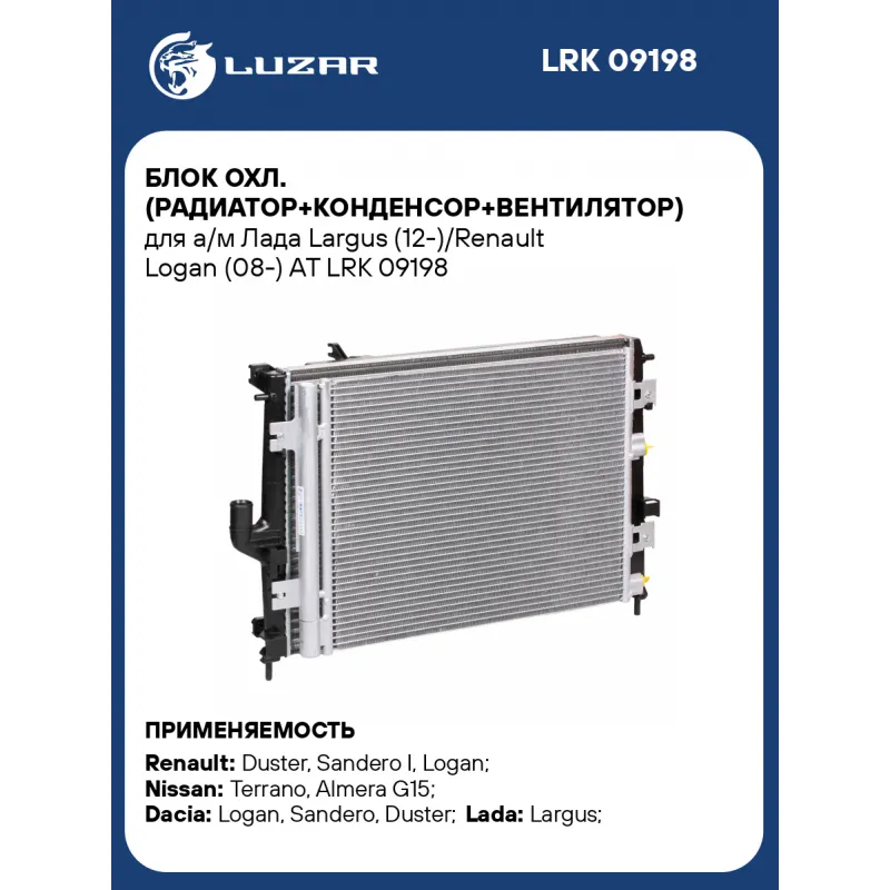 Блок охл. (радиатор+конденсор+вентилятор) для а/м Лада Largus (12-)/Renault Logan (08-) AT Характеристики: Артикул: LRK 09198 OEM номера: 8200582026, 8200741257, 8200765566, 6001550562, 21410-1752R, 92100 7794R, 8200029471, 214815057R, 214100598R Количество на автомобиль: 1 Трансмиссия: MT/AT Кондиционер: + Сопутствующий товар: Радиаторы охлаждения: LRc 09198 Сопутствующий товар: Радиаторы кондиционера (конденсеры): LRAC 0961 Сопутствующий товар: Электровентиляторы охлаждения: LFc 0966 Сопутствующий товар: Патрубки охлаждения (комплект): LPK 0115, LPK 0926, LPK 0927 Состав:: LRc 09198+LRAC 0961+LFc 0966 Подходит для авто: Renault Duster (10-), Sandero I (09-), Logan (08-), Duster (10-) Nissan Terrano (14-), Almera G15 (12-) Dacia Logan (08-), Sandero (09-), Duster (10-) ВАЗ Largus (12-) Для проверки применяемости отправьте VIN автомобиля через вкладку "Есть вопросы о товаре?" Комплектация: Блок охлаждения в сборе Паспорт изделия Гарантия: от 1 года.