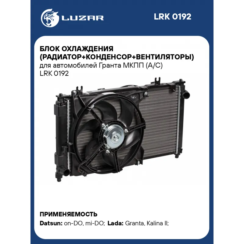 Блок охлаждения (радиатор+конденсор+вентиляторы) для автомобилей Гранта МКПП (А/С) Характеристики: Артикул: LRK 0192 OEM номера: 21908112010, 21900-1332025-11, 2192-1301012, 921215PA0A, 21590-5PA0A, 28351-5PA0A Сопутствующий товар: Патрубки охлаждения (комплект): LPK 0190 Количество на автомобиль: 1 Трансмиссия: MT/AMT Кондиционер: +/- Сопутствующий товар: Радиаторы охлаждения: LRc 01192b; LRc 01194; LRc 01900; LRc 0190b; LRc 0192b; LRc 0194 Сопутствующий товар: Радиаторы кондиционера (конденсеры): LRAC 0190; LRAC 0194 Состав:: LRc 01900+LRAC 0190+LFc 0190+LFAC 0190 Подходит для авто: Datsun on-DO (14-), mi-DO (15-) ВАЗ Granta (10-), Kalina II (13-) Для проверки применяемости отправьте VIN автомобиля через вкладку "Есть вопросы о товаре?" Комплектация: Блок охлаждения в сборе Паспорт изделия Гарантия: от 1 года.