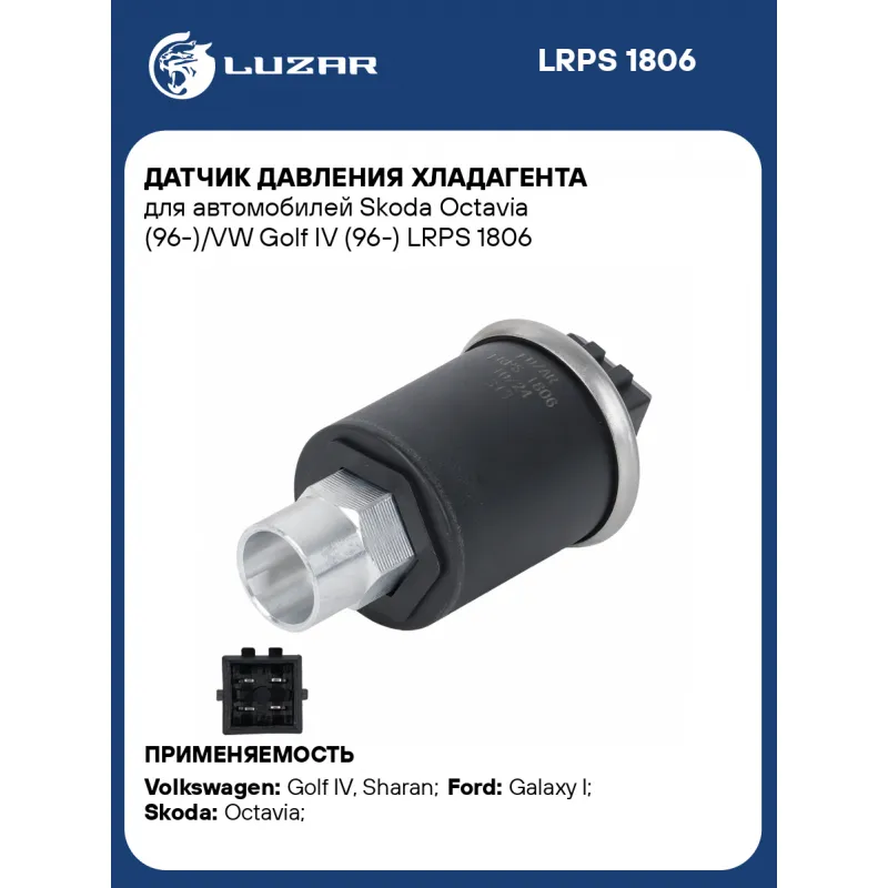 Датчик давления хладагента для автомобилей Skoda Octavia (96-)/VW Golf IV (96-) Характеристики: Артикул: LRPS 1806 OEM номера: 7238088, 1H0959139, 1H0959139A, 1H0959139B, 7M3959139 Размер резьбы: 7/16-20UNF Напряжение, В: 12 Тип резьбы: Внутренняя резьба Количество на автомобиль: 1 Подходит для авто: Volkswagen Golf IV (97-), Sharan (95-), Golf IV (97-), Transporter T4 (90-) Ford Galaxy I (95-) Skoda Octavia (96-) Для проверки применяемости отправьте VIN автомобиля через вкладку "Есть вопросы о товаре?" Комплектация: Датчик давления хладагента Гарантия: от 1 года.