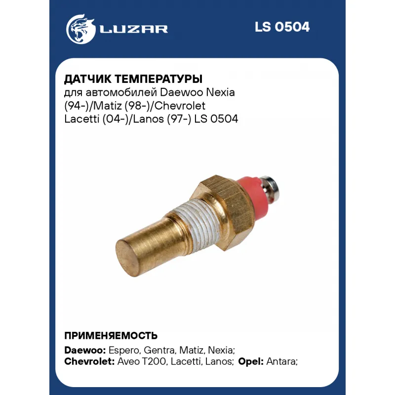 Датчик температуры для автомобилей Daewoo Nexia (94-)/Matiz (98-)/Chevrolet Lacetti (04-)/Lanos (97-) Характеристики: Артикул: LS 0504 OEM номера: 9108291, 8859233, 96177604, 95025043, 4803631, 93290234, 4818935 Размер резьбы: 1/8-27 NPT Количество на автомобиль: 1 Трансмиссия: MT Кондиционер: +/- Сопротивление при температуре 80°С, Ом: 101 Сопротивление при температуре 100°С, Ом: 53 Сопротивление при температуре 40°С, Ом: 470 Подходит для авто: Daewoo Espero (90-), Gentra (05-), Espero (90-), Matiz (98-), Matiz (01-), Nexia (94-), Lanos (97-), Leganza (97-), Nubira (99-), Kalos (02-), Gentra X (08-), Nubira III (03-), Nexia new (08-), Winstorm (07-), Winstorm (07-) Chevrolet Aveo T200 (02-), Lacetti (02-), Lanos (97-), Leganza (97-), Nubira (99-), Captiva (06-), Rezzo (00-) Opel Antara (06-) Для проверки применяемости отправьте VIN автомобиля через вкладку "Есть вопросы о товаре?" Комплектация: Датчик температуры - 1 шт Гарантия: от 1 года.