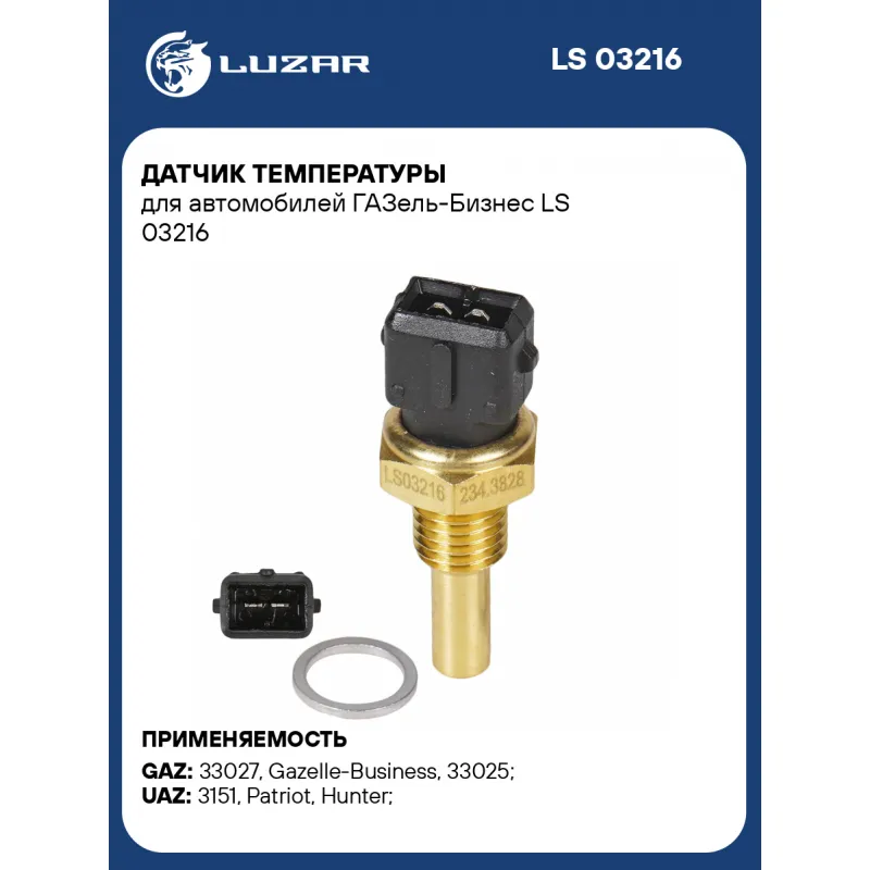 Датчик температуры для автомобилей ГАЗель-Бизнес Характеристики: Артикул: LS 03216 OEM номера: 234.3828, 40.5215, 421.3828 Размер резьбы: M12*1,5 Количество на автомобиль: 1 Трансмиссия: MT Кондиционер: +/- Сопротивление при температуре 100°С, Ом: 200 Сопротивление при температуре 40°С, Ом: 1594 Сопротивление при температуре 80°С, Ом: 373 Подходит для авто: ГАЗ 33027, Gazelle-Business, 33025 УАЗ 3151 (85-), Patriot (97-), Hunter (УАЗ-315195) (03-) Для проверки применяемости отправьте VIN автомобиля через вкладку "Есть вопросы о товаре?" Комплектация: Датчик температуры - 1 шт Уплотнительная прокладка - 1 шт Гарантия: от 1 года.