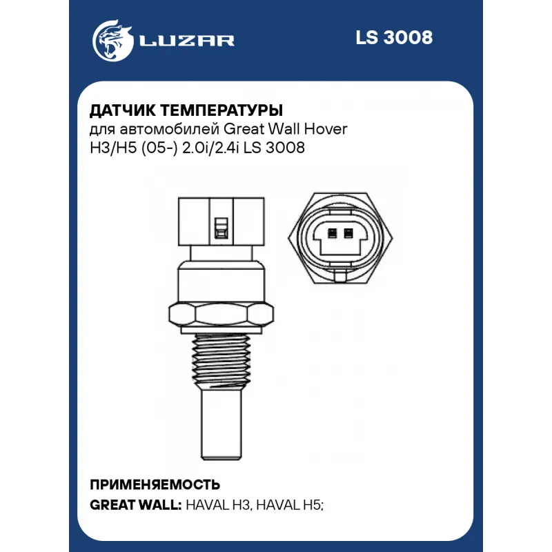 Датчик температуры для автомобилей Great Wall Hover H3/H5 (05-) 2.0i/2.4i Характеристики: Артикул: LS 3008 OEM номера: SMW250119 Размер резьбы: M12x1,5 Сопутствующий товар: Термостаты: LT 3005 Количество на автомобиль: 1 Сопротивление при температуре 80°С, Ом: 348 Сопротивление при температуре 100°С, Ом: 178 Комплектация (кол-во деталей, описание): шайба Сопротивление при температуре 40°С, Ом: 1465 Комплектация: Датчик температуры - 1 шт Шайба - 1 шт Гарантия: от 1 года.