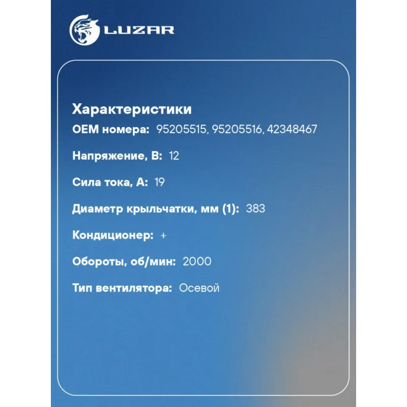 Электровентилятор охлаждения для автомобилей Chevrolet Spark (16-)/Ravon R2 (16-) 1.2i (с кожухом) Характеристики: Артикул: LFK 0505 OEM номера: 95205515, 95205516, 42348467 Мощность, Вт: 228 Сила тока, А: 19 Кондиционер: + Обороты, об/мин: 2000 Тип вентилятора: осевой Диаметр крыльчатки, мм (1): 383 Диаметр крыльчатки, мм (2): - Сопутствующий товар: Радиаторы охлаждения: LRc 0514 Сопутствующий товар: Радиаторы кондиционера (конденсеры): LRAC 05141 Количество на автомобиль: 1 Напряжение, В: 12 Комплектация: Электровентилятор охлаждения - 1 шт Паспорт изделия - 1 шт Гарантия: от 1 года.