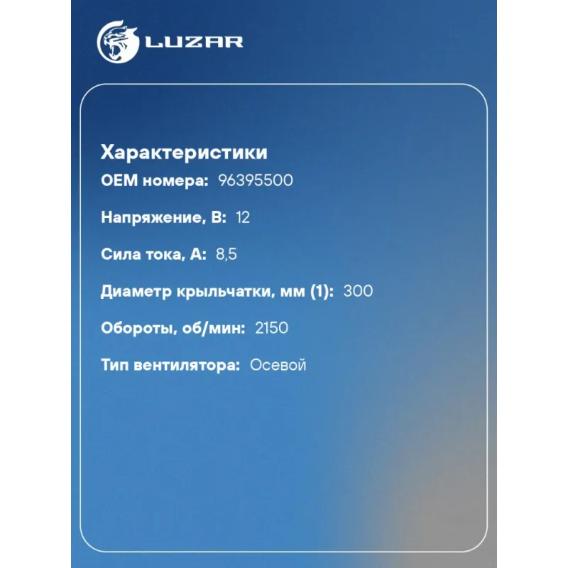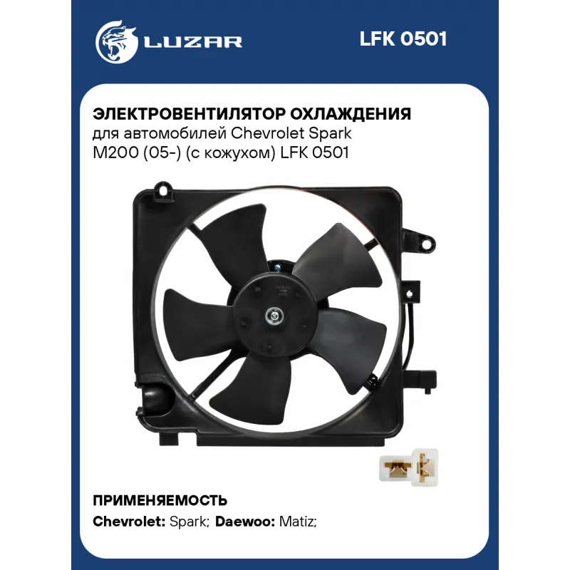 Электровентилятор охлаждения для автомобилей Chevrolet Spark M200 (05-) (с кожухом) Характеристики: Артикул: LFK 0501 OEM номера: 96395500 Количество на автомобиль: 1 Напряжение, В: 12 Сила тока, А: 8,5 Диаметр крыльчатки, мм (1): 300 Обороты, об/мин: 2150 Тип вентилятора: осевой Диаметр крыльчатки, мм (2): - Мощность, Вт: 102 С... Читать полностью →