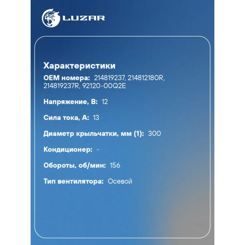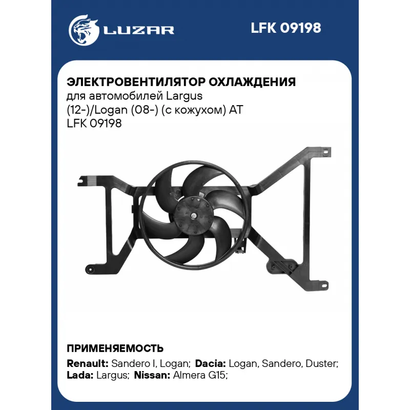 Электровентилятор охлаждения для автомобилей Largus (12-)/Logan (08-) (с кожухом) AT Характеристики: Артикул: LFK 09198 OEM номера: 214819237, 214812180R, 214819237R, 92120-00Q2E Количество на автомобиль: 1 Напряжение, В: 12 Диаметр крыльчатки, мм (1): 300 Кондиционер: - Тип вентилятора: Осевой Диаметр крыльчатки, мм (2): - Сопутствующий товар: Радиаторы охлаждения: LRc 0901; LRc 0905; LRc 0908; LRc 09198; LRc 0938; LRc RELo04334; LRc RELo04382; LRc RELo08139 Сопутствующий товар: Радиаторы кондиционера (конденсеры): LRAC 0961; LRAC RELo04360 Сопутствующий товар: Резисторы нагрузочные: LFR 0966; LFR 0969; LFR 0991 Подходит для авто: Renault Sandero I (09-), Logan (08-) Dacia Logan (08-), Sandero (09-), Duster (10-) ВАЗ Largus (12-) Nissan Almera G15 (12-) Для проверки применяемости отправьте VIN автомобиля через вкладку "Есть вопросы о товаре?" Комплектация: Электровентилятор охлаждения - 1 шт Паспорт изделия - 1 шт Гарантия: от 1 года.