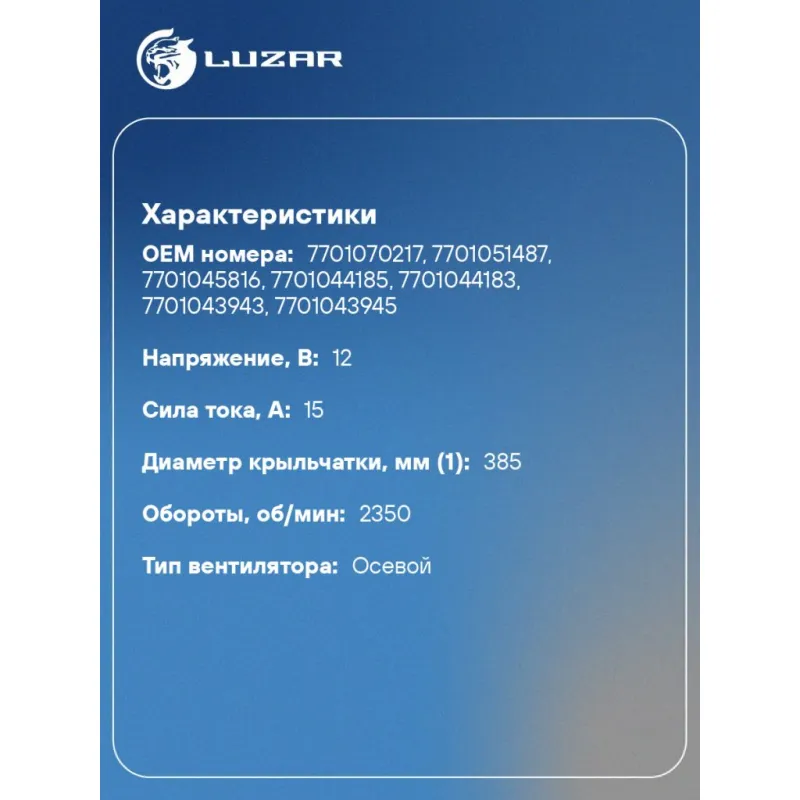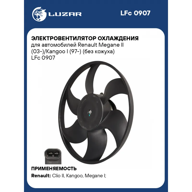 Электровентилятор охлаждения для автомобилей Renault Megane II (03-)/Kangoo I (97-) (без кожуха) Характеристики: Артикул: LFc 0907 OEM номера: 7701070217, 7701051487, 7701045816, 7701044185, 7701044183, 7701043943, 7701043945 Количество на автомобиль: 1 Напряжение, В: 12 Сила тока, А: 15 Диаметр крыльчатки, мм (1): 385 Обороты, об/мин: 2350 Тип вентилятора: осевой Мощность, Вт: 180 Подходит для авто: Renault Clio II (98-), Kangoo (97-), Kangoo (97-), Megane I (95-), Megane II (02-), Scenic I (96-), Symbol II (08-), Clio II (98-), Kangoo II (07-), Kangoo II (07-), Megane I (95-), Megane II (02-), Scenic I (96-), Scenic I (96-), Trafic II (01-), Symbol (01-) Для проверки применяемости отправьте VIN автомобиля через вкладку "Есть вопросы о товаре?" Комплектация: Электровентилятор охлаждения - 1 шт Паспорт изделия - 1 шт Гарантия: от 1 года.