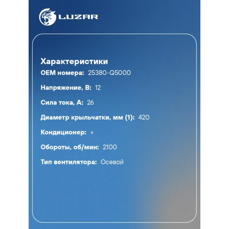 Электровентилятор охлаждения для автомобилей Seltos (19-) 1.6i (с кожухом) Характеристики: Артикул: LFK 0848 OEM номера: 25380-Q5000 Количество на автомобиль: 1 Напряжение, В: 12 Сила тока, А: 26 Диаметр крыльчатки, мм (1): 420 Кондиционер: + Обороты, об/мин: 2100 Тип вентилятора: осевой Мощность, Вт: 312 Сопутствующий товар: Резисторы нагрузочные: LFR 0865 Подходит для авто: Kia Seltos (19-) Для проверки применяемости отправьте VIN автомобиля через вкладку "Есть вопросы о товаре?" Комплектация: Электровентилятор охлаждения - 1 шт Паспорт изделия - 1 шт Гарантия: от 1 года.