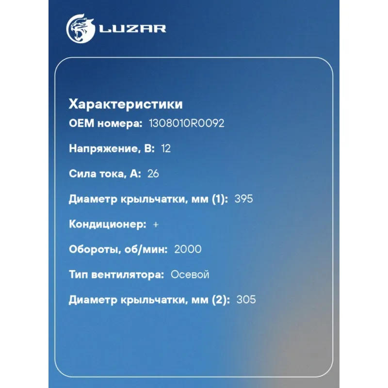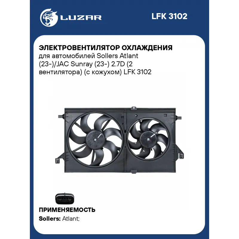 Электровентилятор охлаждения для автомобилей Sollers Atlant (23-)/JAC Sunray (23-) 2.7D (2 вентилятора) (с кожухом) Характеристики: Артикул: LFK 3102 OEM номера: 1308010R0092 Количество на автомобиль: 1 Напряжение, В: 12 Сила тока, А: 26 Диаметр крыльчатки, мм (1): 395 Кондиционер: + Обороты, об/мин: 2000 Тип вентилятора: осевой Диаметр крыльчатки, мм (2): 305 Мощность, Вт: 312 Сопутствующий товар: Радиаторы охлаждения: LRc 3060 Сопутствующий товар: Радиаторы кондиционера (конденсеры): LRAC 3060 Подходит для авто: Sollers Atlant (22-) Для проверки применяемости отправьте VIN автомобиля через вкладку "Есть вопросы о товаре?" Комплектация: Электровентилятор охлаждения - 1 шт Паспорт изделия - 1 шт Гарантия: от 1 года.