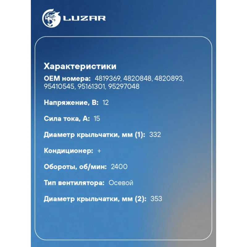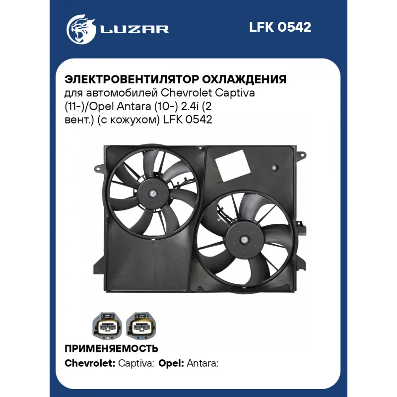 Электровентилятор охлаждения для автомобилей Chevrolet Captiva (11-)/Opel Antara (10-) 2.4i (2 вент.) (с кожухом) Характеристики: Артикул: LFK 0542 OEM номера: 4819369, 4820848, 4820893, 95410545, 95161301, 95297048 Мощность, Вт: 360 Сила тока, А: 15 Кондиционер: + Обороты, об/мин: 2400 Тип вентилятора: осевой Диаметр крыльчатки, мм (1): 332 Диаметр крыльчатки, мм (2): 353 Сопутствующий товар: Радиаторы охлаждения: LRc 05142 Сопутствующий товар: Радиаторы кондиционера (конденсеры): LRAC 0543 Количество на автомобиль: 1 Напряжение, В: 12 Подходит для авто: Chevrolet Captiva (11-) Opel Antara (06-) Для проверки применяемости отправьте VIN автомобиля через вкладку "Есть вопросы о товаре?" Комплектация: Электровентилятор oхлаждения - 1 шт Паспорт изделия - 1 шт Гарантия: от 1 года.