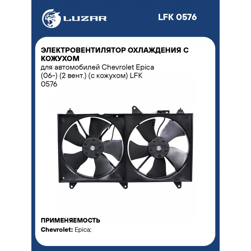 Электровентилятор охлаждения с кожухом для автомобилей Chevrolet Epica (06-) (2 вент.) (с кожухом) Характеристики: Артикул: LFK 0576 OEM номера: 96838443, 96640489, 95223800, 96492889, 96328704 Количество на автомобиль: 1 Напряжение, В: 12 Сила тока, А: 6,3 Диаметр крыльчатки, мм (1): 322 Обороты, об/мин: 2060 Тип вентилятора: Осевой Диаметр крыльчатки, мм (2): 323 Мощность, Вт: 75,6 Сопутствующий товар: Радиаторы охлаждения: LRc 05177; LRc 0576 Сопутствующий товар: Радиаторы кондиционера (конденсеры): LRAC 0576 Подходит для авто: Chevrolet Epica (06-) Для проверки применяемости отправьте VIN автомобиля через вкладку "Есть вопросы о товаре?" Комплектация: Электровентилятор охлаждения - 1 шт Паспорт изделия - 1 шт Гарантия: от 1 года.