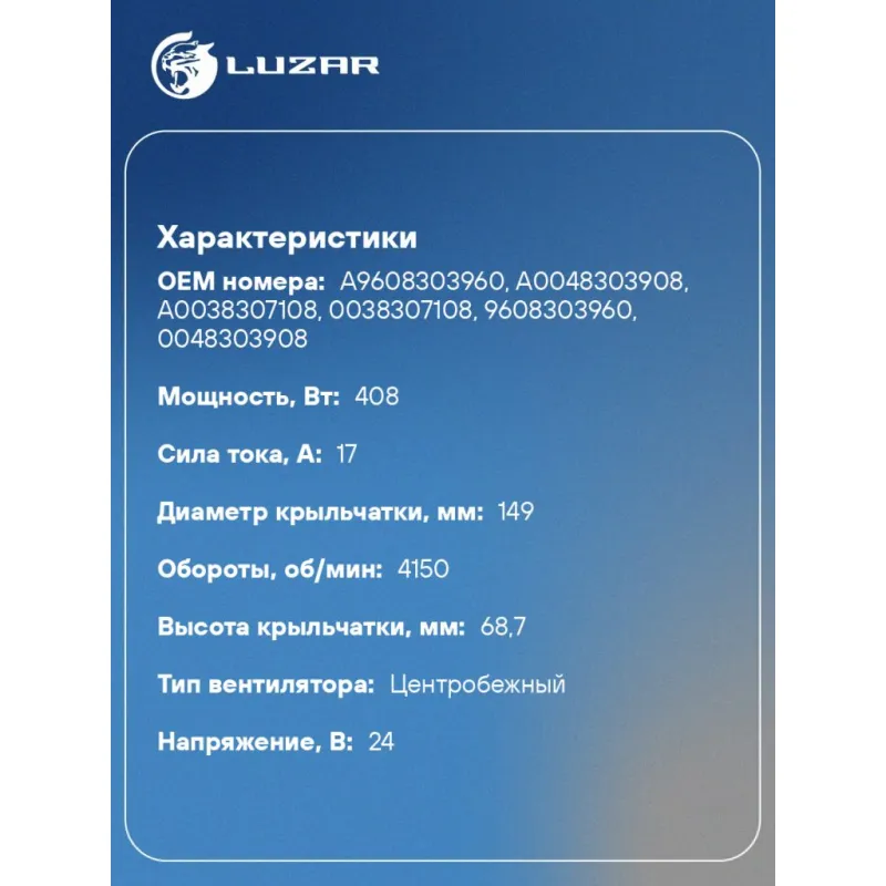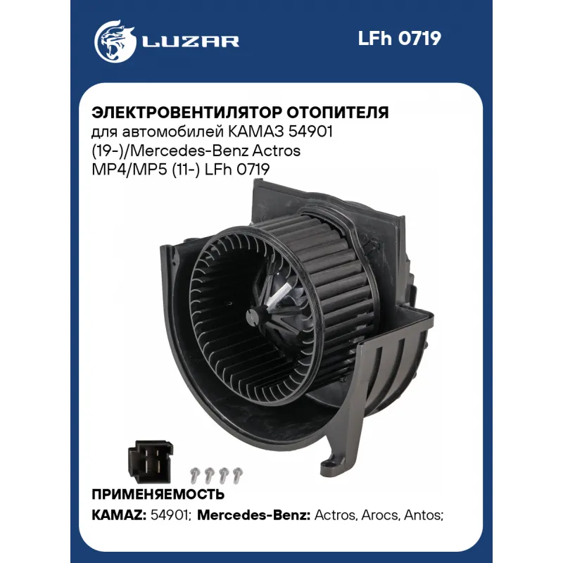 Электровентилятор отопителя для автомобилей КАМАЗ 54901 (19-)/Mercedes-Benz Actros MP4/MP5 (11-) Характеристики: Артикул: LFh 0719 OEM номера: A9608303960, A0048303908, A0038307108, 0038307108, 9608303960, 0048303908 Количество на автомобиль: 1 Диаметр крыльчатки, мм: 149 Обороты, об/мин: 4150 Напряжение, В: 24 Сила тока, А: 17 Тип вентилятора: центробежный Высота крыльчатки, мм: 68,7 Мощность, Вт: 408 Конструкция: в сборе с корпусом Модуль управления: встроенный Подходит для авто: КамаАЗ 54901 Mercedes-Benz Actros (11-), Arocs (13-), Antos (12-) Для проверки применяемости отправьте VIN автомобиля через вкладку "Есть вопросы о товаре?" Комплектация: Электровентилятор отопителя - 1 шт Паспорт изделия - 1 шт Гарантия: от 1 года.