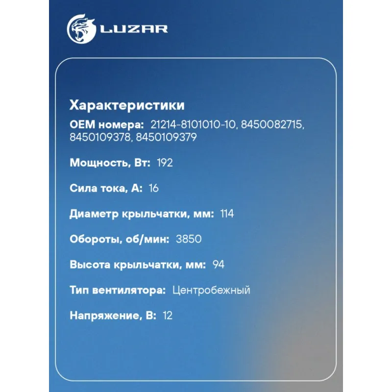Электровентилятор отопителя для автомобилей Лада 4x4 FL (19-) Характеристики: Артикул: LFh 0128 OEM номера: 21214-8101010-10, 8450082715, 8450109378, 8450109379 Мощность, Вт: 192 Сила тока, А: 16 Диаметр крыльчатки, мм: 114 Обороты, об/мин: 3850 Высота крыльчатки, мм: 94 Тип вентилятора: центробежный Напряжение, В: 12 Количество на автомобиль: 1 Подходит для авто: ВАЗ 2121, 2121 Для проверки применяемости отправьте VIN автомобиля через вкладку "Есть вопросы о товаре?" Комплектация: Электровентилятор отопителя - 1 шт Паспорт изделия - 1 шт Гарантия: от 1 года.