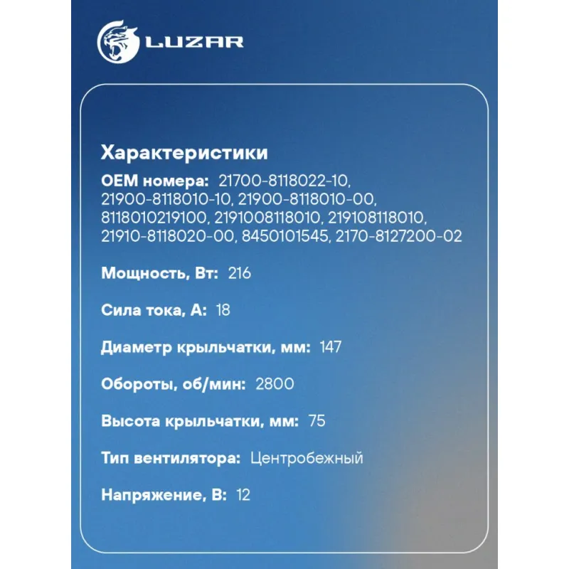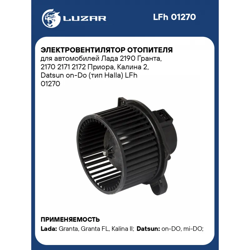 Электровентилятор отопителя для автомобилей Лада 2190 Гранта, 2170 2171 2172 Приора, Калина 2, Datsun on-Do (тип Halla) Характеристики: Артикул: LFh 01270 OEM номера: 21700-8118022-10, 21900-8118010-10, 21900-8118010-00, 8118010219100, 2191008118010, 219108118010, 21910-8118020-00, 8450101545, 2170-8127200-02, 21700-8118020-10, 8450004062, 8450004061, 21918118010, 21910-8118010-00, 21900811801020, 21910811801010, 21910811801030, 21920811801000, 27226-5PA0A, 27226-5PA0B, 27226-5PA0C Количество на автомобиль: 1 Диаметр крыльчатки, мм: 147 Обороты, об/мин: 2800 Напряжение, В: 12 Сила тока, А: 18 Тип вентилятора: Центробежный Высота крыльчатки, мм: 75 Мощность, Вт: 216 Сопутствующий товар: Резисторы нагрузочные: LFR 0807 Кондиционер: + Подходит для авто: ВАЗ Granta (15-), Granta FL (18-), Kalina II (15-), Priora (07-), Granta (10-), Kalina II (13-) Datsun on-DO (14-), mi-DO (15-) Для проверки применяемости отправьте VIN автомобиля через вкладку "Есть вопросы о товаре?" Комплектация: Паспорт изделия - 1 шт Электровентилятор отопителя - 1 шт Гарантия: от 1 года.