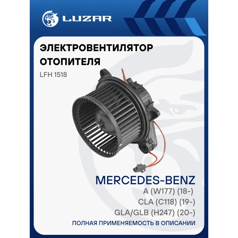 Электровентилятор отопителя для автомобилей Mercedes-Benz GLA/GLB (H247) (20-)/CLA (C118) (19-)/A (W177) (18-) Характеристики: Артикул: LFh 1518 OEM номера: 2478308400, A2478308400 Количество на автомобиль: 1 Диаметр крыльчатки, мм: 150 Обороты, об/мин: 3500 Напряжение, В: 12 Сила тока, А: 22 Тип вентилятора: центробежный Высота крыльчатки, мм: 73,5 Мощность, Вт: 264 Подходит для авто: Mercedes-Benz A-Class W177 (18-), B-Class W247 (18-), GLA H247 (20-), CLA C118 (19-) Для проверки применяемости отправьте VIN автомобиля через вкладку "Есть вопросы о товаре?" Комплектация: Электровентилятор отопителя - 1 шт Паспорт изделия - 1 шт Гарантия: от 1 года.