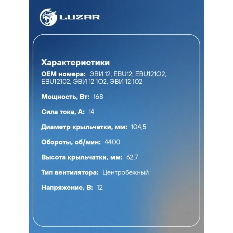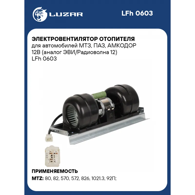 Электровентилятор отопителя для автомобилей МТЗ, ПАЗ, АМКОДОР 12В (аналог ЭВИ/Радиоволна 12) Характеристики: Артикул: LFh 0603 OEM номера: ЭВИ 12, EBU12, EBU121O2, EBU12102, ЭВИ 12 1О2, ЭВИ 12 102 Мощность, Вт: 168 Сила тока, А: 14 Диаметр крыльчатки, мм: 104,5 Обороты, об/мин: 4400 Высота крыльчатки, мм: 62,7 Напряжение, В: 12 Количество на автомобиль: 1 Тип вентилятора: центробежный Аналог: РАДИОВОЛНА ЭВИ 12 Конструкция: в сборе с корпусом Подходит для авто: MTZ 80, 82, 570, 572, 826, 1021.3, 92П, 892, 1220.5, 1221.5, 922.5, 952.5 Для проверки применяемости отправьте VIN автомобиля через вкладку "Есть вопросы о товаре?" Комплектация: Э/вентилятор отопителя - 1 шт Паспорт изделия - 1 шт Гарантия: от 1 года.