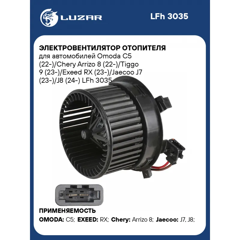 Электровентилятор отопителя для автомобилей Omoda С5 (22-)/Chery Arrizo 8 (22-)/Tiggo 9 (23-)/Exeed RX (23-)/Jaecoo J7 (23-)/J8 (24-) Характеристики: Артикул: LFh 3035 OEM номера: 301001542AA Мощность, Вт: 180 Сила тока, А: 15 Диаметр крыльчатки, мм: 149 Обороты, об/мин: 3300 Высота крыльчатки, мм: 68,7 Напряжение, В: 12 Сопутствующий товар: Резисторы нагрузочные: LFR 3003 Количество на автомобиль: 1 Тип вентилятора: центробежный Подходит для авто: OMODA C5 (22-) EXEED RX (23-) Chery Arrizo 8 (22-) Jaecoo J7 (23-), J8 (24-) Для проверки применяемости отправьте VIN автомобиля через вкладку "Есть вопросы о товаре?" Комплектация: Электровентилятор отопителя - 1 шт Паспорт изделия - 1 шт Гарантия: от 1 года.