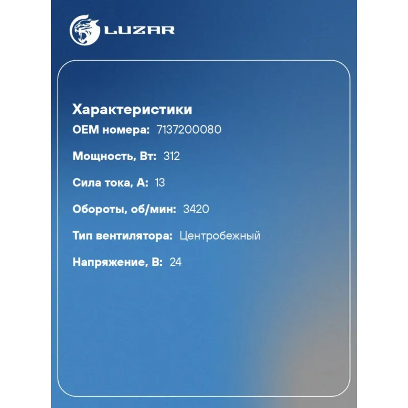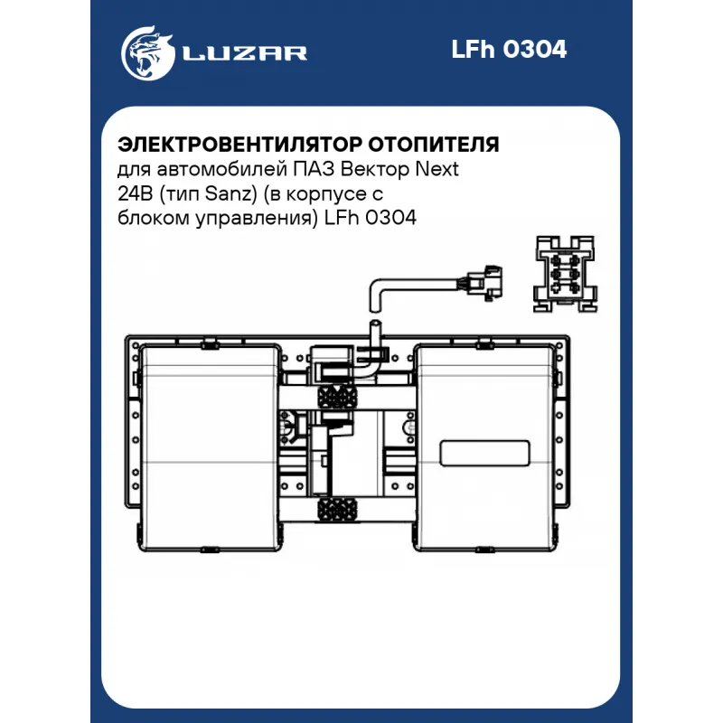 Электровентилятор отопителя для автомобилей ПАЗ Вектор Next 24В (тип Sanz) (в корпусе с блоком управления) Характеристики: Артикул: LFh 0304 OEM номера: 7137200080 Мощность, Вт: 312 Сила тока, А: 13 Диаметр крыльчатки, мм: - Обороты, об/мин: 3420 Высота крыльчатки, мм: - Тип вентилятора: центробежный Напряжение, В: 24 Количество на автомобиль: 1 Конструкция: в сборе с корпусом и встроенным блоком управления Комплектация: Электровентилятор отопителя - 1 шт Паспорт изделия - 1 шт Гарантия: от 1 года.