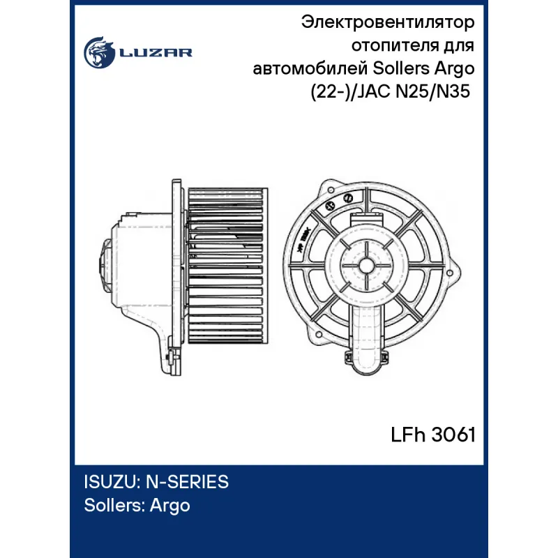 Электровентилятор отопителя для автомобилей Sollers Argo (22-)/JAC N25/N35 (19-) Характеристики: Артикул: LFh 3061 OEM номера: 8126114W5000 Мощность, Вт: 246 Сила тока, А: 20,5 Диаметр крыльчатки, мм: 146,4 Обороты, об/мин: 3300 Высота крыльчатки, мм: 75,2 Тип вентилятора: центробежный Напряжение, В: 12 Сопутствующий товар: Ради... Читать полностью →