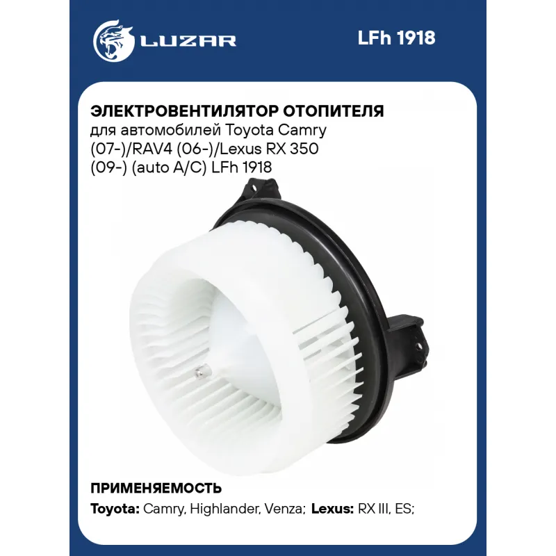 Электровентилятор отопителя для автомобилей Toyota Camry (07-)/RAV4 (06-)/Lexus RX 350 (09-) (auto A/C) Характеристики: Артикул: LFh 1918 OEM номера: 8710333090, 8710348080, 871030E040, 8710360400, 8710307040, 871030C040, 8710306100, 8710306110, 871030E070 Напряжение, В: 12 Количество на автомобиль: 1 Диаметр крыльчатки, мм: 165 Обороты, об/мин: 2750 Сила тока, А: 20 Тип вентилятора: Центробежный Высота крыльчатки, мм: 70 Мощность, Вт: 240 Подходит для авто: Toyota Camry (06-), Highlander (08-), Venza (09-), Camry (11-), Land Cruiser Prado 150 (09-), Highlander (13-), RAV 4 (06-), RAV 4 (13-), RAV 4 (06-), Tundra (06-) Lexus RX III (09-), ES (06-) Для проверки применяемости отправьте VIN автомобиля через вкладку "Есть вопросы о товаре?" Комплектация: Электровентилятор отопителя - 1 шт Паспорт изделия - 1 шт Гарантия: от 1 года.