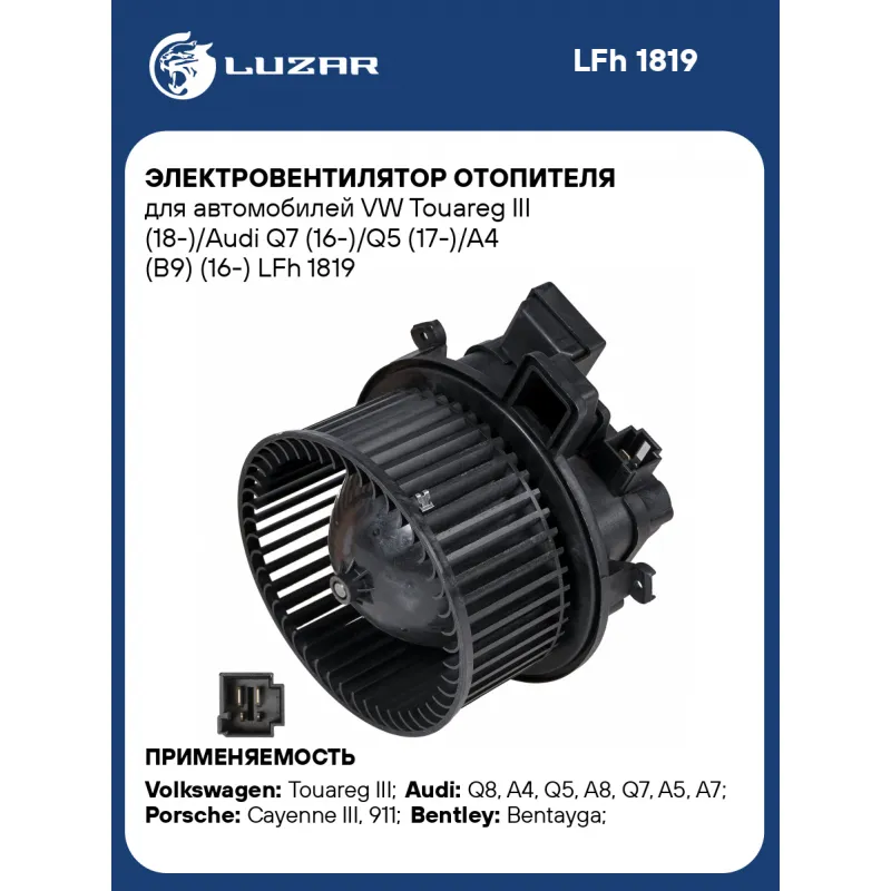 Электровентилятор отопителя для автомобилей VW Touareg III (18-)/Audi Q7 (16-)/Q5 (17-)/A4 (B9) (16-) Характеристики: Артикул: LFh 1819 OEM номера: 4M1820021, 4M1820021C, 4M1820021B, 4M1820021A, PAB82002100, PAB820021A Количество на автомобиль: 1 Диаметр крыльчатки, мм: 146 Обороты, об/мин: 3200 Напряжение, В: 12 Сила тока, А: 15 Тип вентилятора: центробежный Высота крыльчатки, мм: 62,5 Мощность, Вт: 180 Модуль управления: встроенный Подходит для авто: Volkswagen Touareg III (18-), Touareg III (18-) Audi Q8 (18-), A4 (15-), Q5 (17-), A8 (17-), Q7 (15-), A4 (15-), A5 (16-), A5 (16-), A7 (18-) Porsche Cayenne III (17-), 911 (992) (19-) Bentley Bentayga (15-) Для проверки применяемости отправьте VIN автомобиля через вкладку "Есть вопросы о товаре?" Комплектация: Электровентилятор отопителя - 1 шт Паспорт изделия - 1 шт Гарантия: от 1 года.