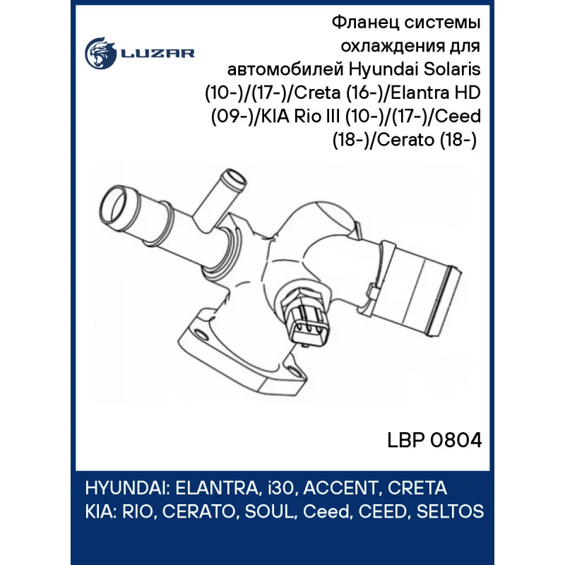 Фланец системы охлаждения для автомобилей Hyundai Solaris (10-)/(17-)/Creta (16-)/Elantra HD (09-)/KIA Rio III (10-)/(17-)/Ceed (18-)/Cerato (18-) (алюминиевый корпус, с датчиком температуры) Характеристики: Артикул: LBP 0804 OEM номера: 256002B003 Кондиционер: + Сопутствующий товар: Датчик температры: LS 0820 Количество на автомобиль: 1 Материал корпуса: алюминий Комплектация (кол-во деталей, описание): уплотнительная прокладка Датчик: в корпусе установлен датчик температуры LS 0820 Сопутсвующие товары: 1: LS 0820 Комплектация: Фланец системы охлаждения - 1 шт Паспорт изделия - 1 шт Гарантия: от 1 года.