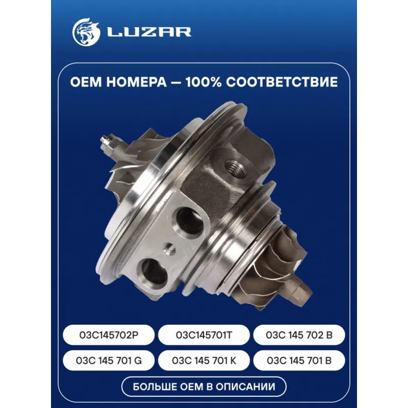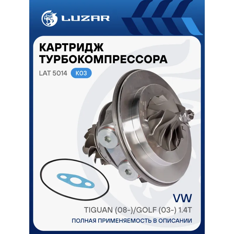 Картридж турбокомпрессора для а/м VW Tiguan (08-)/Golf (03-) 1.4T (тип К03) Характеристики: Артикул: LAT 5014 OEM номера: 03C145702P, 03C145701T, 03C 145 702 B, 03C 145 701 B, 03C 145 701 G, 03C 145 701 K, 03C145701Q, 03C 145 703 A Количество на автомобиль: 1 Тип картриджа: K03 Применение: 1.4 TSI [CTHA; BWK; CAVA] 150 л.с. [CNWA;CTHD; CAVD] 160 л.с 1.4 TSI [BMY] 140 л.с. 1.4 TSI [BLG] 170 л.с. Сопутствующий товар: Радиаторы интеркулера (онв): LRIC 18N5; LRIC 18N6 Подходит для авто: Volkswagen Tiguan (08-), Touran (03-), Jetta (05-), Jetta (11-), Golf VI (08-), Golf V (03-), Passat B7 (10-) Для проверки применяемости отправьте VIN автомобиля через вкладку "Есть вопросы о товаре?" Комплектация: Турбокомпрессор без корпуса (картридж) - 1 шт Комплект прокладок - 2 шт Паспорт изделия - 1 шт Гарантия: от 1 года.