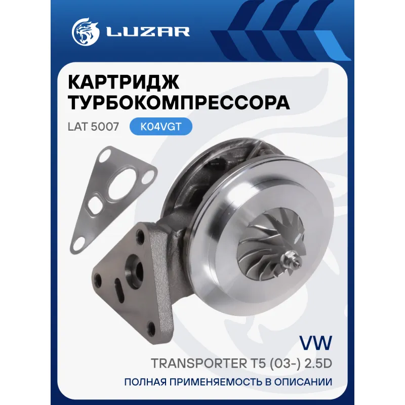 Картридж турбокомпрессора для а/м VW Transporter T5 (03-) 2.5D (тип K04VGT) Характеристики: Артикул: LAT 5007 OEM номера: 070145701E Количество на автомобиль: 1 Сопутствующий товар: Радиаторы интеркулера (онв): LRIC 18H7 Комплектация: Турбокомпрессор без корпуса (картридж) - 1 шт Прокладка - 1 шт Паспорт изделия - 1 шт Гарантия: от 1 года.