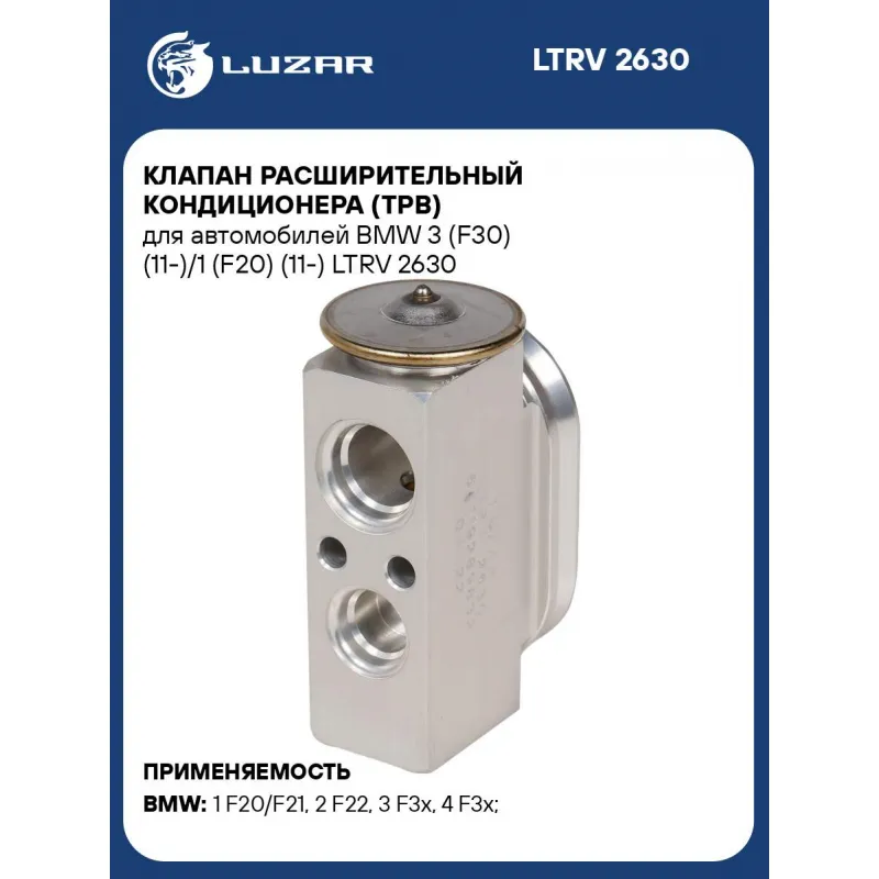 Клапан расширительный кондиционера (ТРВ) для автомобилей BMW 3 (F30) (11-)/1 (F20) (11-) Характеристики: Артикул: LTRV 2630 OEM номера: 64 11 9 289 832 Количество на автомобиль: 1 Материал: алюминий Сопутствующий товар: Радиаторы кондиционера (конденсеры): LRAC 26111 Сопутствующий товар: Компрессоры кондиционера: LCAC 2630; LCAC 2684 Подходит для авто: BMW 1 F20/F21 (11-), 1 F20/F21 (11-), 2 F22 (13-), 1 F20/F21 (11-), 1 F20/F21 (11-), 3 F3x (11-), 3 F3x (11-), 4 F3x (13-) Для проверки применяемости отправьте VIN автомобиля через вкладку "Есть вопросы о товаре?" Комплектация: Клапан расширительный кондиционера (ТРВ) Паспорт изделия Гарантия: от 1 года.