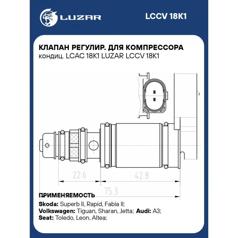 Клапан регулир. для компрессора кондиц. LCAC 18K1 LUZAR Характеристики: Артикул: LCCV 18K1 OEM номера: LCAC 18K1 Ограничение производителя: LUZAR Ид.№ компрессора: LCAC 18K1 Количество на автомобиль: 1 Сопутствующий товар: Компрессоры кондиционера: LCAC 18K1; Совместимость с компрессорами LUZAR: Совместим с LCAC 18K1; Подходит для авто: Skoda Superb II (08-), Rapid (12-), Fabia II (07-), Octavia A5 (04-), Yeti (09-), Octavia A7 (13-) Volkswagen Tiguan (08-), Sharan (10-), Jetta (11-), Golf V (03-), Golf VI (08-), Jetta (05-), Passat B6 (05-), Caddy (04-), Eos (06-), Touran (03-), CC (11-), CC (08-) Audi A3 (07-), A3 (03-) Seat Toledo (04-), Leon (05-), Altea (04-), Toledo (12-) Для проверки применяемости отправьте VIN автомобиля через вкладку "Есть вопросы о товаре?" Комплектация: Клапан регулирующий компрессора кондиционера Гарантия: от 1 года.