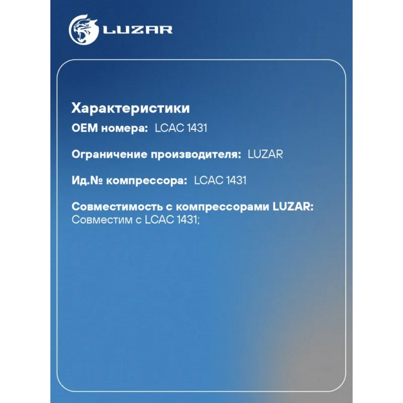 | Совместимость с компрессорами LUZAR | Совместим с LCAC 1431; |
