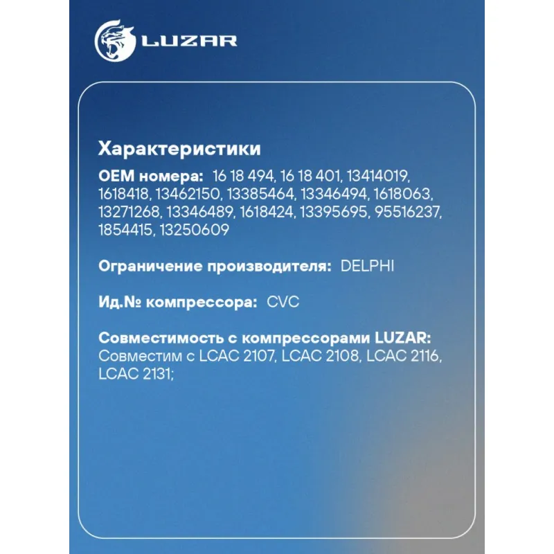 Совместимость с компрессорами LUZAR Совместим с LCAC 2107, LCAC 2108, LCAC 2116, LCAC 2131;