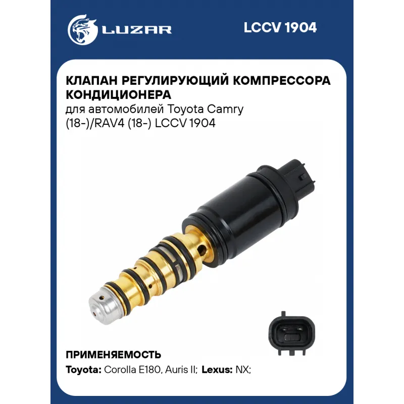 Клапан регулирующий компрессора кондиционера для автомобилей Toyota Camry (18-)/RAV4 (18-) Характеристики: Артикул: LCCV 1904 OEM номера: 88310-02790, 88310-02780, 88310-1A840, 88310-1A841, 88310-33320, 88310-33350 Ограничение производителя: Denso Ид.№ компрессора: 7SES17C Количество на автомобиль: 1 Совместимость с компрессорами LUZAR: Несовместим Подходит для авто: Toyota Corolla E180 (13-), Auris II (12-), Corolla E210 (18-), RAV 4 (13-), Camry (18-), RAV 4 (18-), Avensis (09-) Lexus NX (14-) Для проверки применяемости отправьте VIN автомобиля через вкладку "Есть вопросы о товаре?" Комплектация: Клапан регулирующий компрессора кондиционера Паспорт изделия Гарантия: от 1 года.