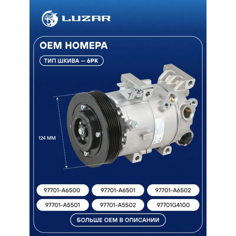 Компрессор кондиционера для автомобилей Ceed (12-)/Cerato III (13-) 1.6i Характеристики: Артикул: LCAC 0865 OEM номера: 97701-A6500, 97701-A6501, 97701-A6502, 97701-A5501, 97701-A5502, 97701G4100, 97701F2500 Сопутствующий товар: Датчики давления хладагента: LRPS 0807 Количество на автомобиль: 1 Объём заправленного масла, мл: 160±10 Вид хладагента: R134a Тип шкива: 6PK Диаметр шкива, мм: 124 Вид заправленного масла: PAG 46 Ид.№ компрессора: VS-14 Сопутствующий товар: Радиаторы кондиционера (конденсеры): LRAC 0819; LRAC 08H2; LRAC 08X0; LRAC 08X6 Сопутствующий товар: Клапаны расширительные кондиционера (ТРВ): LTRV 0865 Сопутствующий товар: Ресиверы-осушители: LCD 0801 Мощность, кВт: 2 Подходит для авто: Hyundai i30 II (11-), Elantra V (11-), Elantra VI (15-) Kia CEE'D (12-), Cerato III (13-), Soul II (14-), CEED (18-), Cerato IV (18-) Для проверки применяемости отправьте VIN автомобиля через вкладку "Есть вопросы о товаре?" Комплектация: Компрессор кондиционера Паспорт изделия Гарантия: от 1 года.
