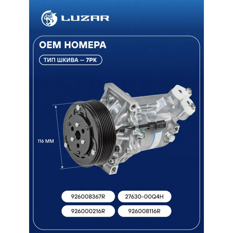 Компрессор кондиционера для автомобилей Duster (15-)/Kaptur (16-) 1.6i [H4M] Характеристики: Артикул: LCAC 0976 OEM номера: 27630-00Q4H, 926008367R, 926000216R, 926008116R Сопутствующий товар: Радиаторы кондиционера (конденсеры): LRAC 0961, LRAC 0978, LRAC 0950 Сопутствующий товар: Датчики давления хладагента: LRPS 0997 Количество на автомобиль: 1 Объём заправленного масла, мл: 150±10 Вид хладагента: R134a Тип шкива: 7PK Диаметр шкива, мм: 116 Вид заправленного масла: PAG 100 Ид.№ компрессора: CR12SC Сопутствующий товар: Клапаны расширительные кондиционера (ТРВ): LTRV 0978 Мощность, Вт: 2 Подходит для авто: Renault Kaptur (16-), Duster (10-), Sandero II (14-) Nissan Terrano (14-) ВАЗ X-Ray (15-) Для проверки применяемости отправьте VIN автомобиля через вкладку "Есть вопросы о товаре?" Комплектация: Компрессор кондиционера Паспорт изделия Гарантия: от 1 года.