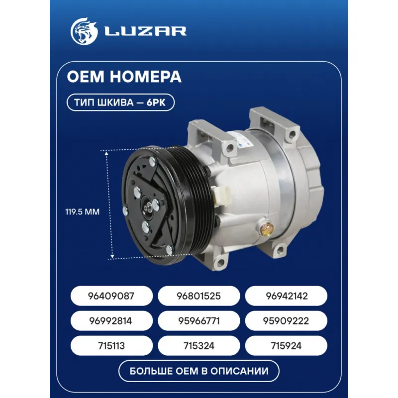 Компрессор кондиционера для автомобилей Epica (06-) 2.0i/2.5 Характеристики: Артикул: LCAC 0576 OEM номера: 96409087, 96801525, 96942142, 96992814, 95966771, 95909222, 715113, 715324, 715924, 730071, 730212, 95954659 Количество на автомобиль: 1 Объём заправленного масла, мл: 200±15 Вид хладагента: R134a Тип шкива: 6PK Диаметр шкива, мм: 119.5 Вид заправленного масла: PAG 46 Ид.№ компрессора: V5 Сопутствующий товар: Радиаторы кондиционера (конденсеры): LRAC 0576 Комплектующие компрессора: LCCV 0501 Мощность, кВт: 2 Подходит для авто: Chevrolet Epica (06-) Для проверки применяемости отправьте VIN автомобиля через вкладку "Есть вопросы о товаре?" Комплектация: Компрессор кондиционера Паспорт изделия Гарантия: от 1 года.