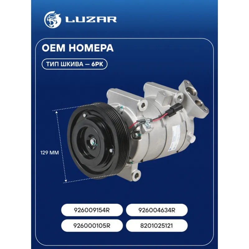 Компрессор кондиционера для автомобилей Fluence (10-)/Logan II (12-) 1.6i Характеристики: Артикул: LCAC 0978 OEM номера: 8201025121, 926009154R , 926004634R, 926000105R Сопутствующий товар: Датчики давления хладагента: LRPS 0978 Количество на автомобиль: 1 Объём заправленного масла, мл: 160 Вид хладагента: R134a Тип шкива: 6PK Диаметр шкива, мм: 129 Вид заправленного масла: PAG 100 Ид.№ компрессора: DKV-11R Сопутствующий товар: Радиаторы кондиционера (конденсеры): LRAC 0914; LRAC 0916; LRAC 0978 Сопутствующий товар: Клапаны расширительные кондиционера (ТРВ): LTRV 0914; LTRV 0978 Мощность, кВт: 2 Подходит для авто: Renault Fluence (10-), Duster (10-), Logan II (12-), Sandero II (14-) Для проверки применяемости отправьте VIN автомобиля через вкладку "Есть вопросы о товаре?" Комплектация: Компрессор кондиционера Паспорт изделия Гарантия: от 1 года.