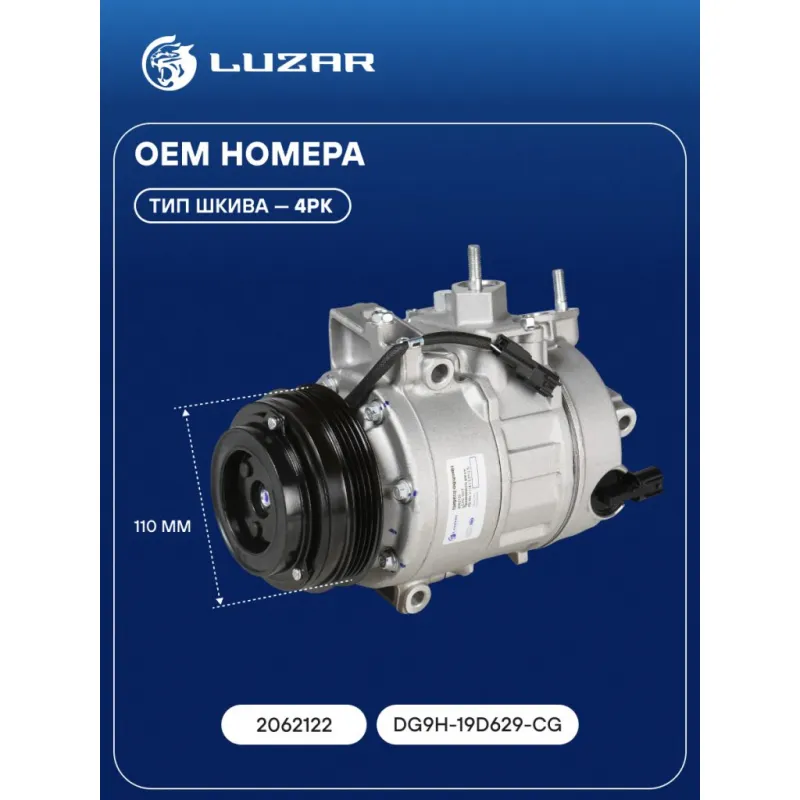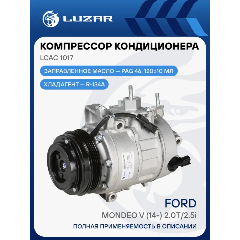 Компрессор кондиционера для автомобилей Ford Mondeo V (14-) 2.0T/2.5i Характеристики: Артикул: LCAC 1017 OEM номера: 2062122, DG9H-19D629-CG Количество на автомобиль: 1 Объём заправленного масла, мл: 120±10 Вид хладагента: R 134a Тип шкива: 4PK Диаметр шкива, мм: 110 Вид заправленного масла: PAG 46 Ид.№ компрессора: 7SEU17 Сопутствующий товар: Радиаторы кондиционера (конденсеры): LRAC 1042 Мощность, кВт: 2,5 Подходит для авто: Ford Mondeo V (15-) Для проверки применяемости отправьте VIN автомобиля через вкладку "Есть вопросы о товаре?" Комплектация: Компрессор кондиционера Уплотнительные кольца - 2 шт Паспорт изделия Гарантия: от 1 года.