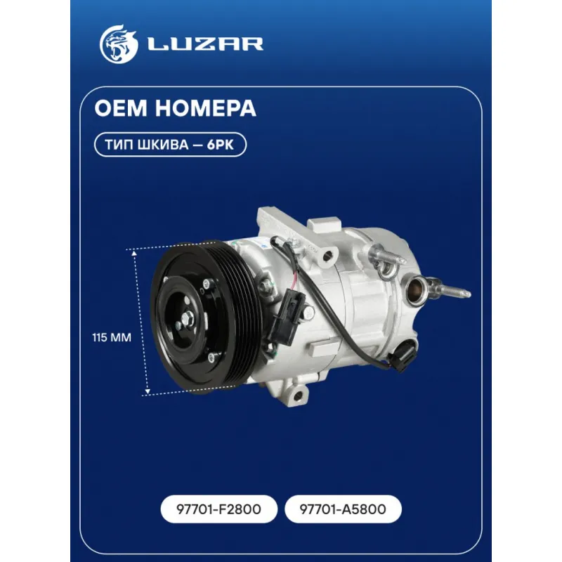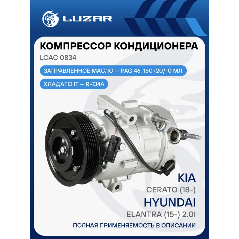 Компрессор кондиционера для автомобилей Kia Cerato (18-)/Hyundai Elantra (15-) 2.0i Характеристики: Артикул: LCAC 0834 OEM номера: 97701-F2800, 97701-A5800 Сопутствующий товар: Радиаторы кондиционера (конденсеры): LRAC 0831 Сопутствующий товар: Клапаны расширительные кондиционера (ТРВ): LTRV 0865 Количество на автомобиль: 1 Объём заправленного масла, мл: 160+20/-0 Вид хладагента: R134a Тип шкива: 6PK Диаметр шкива, мм: 115 Вид заправленного масла: PAG 46 Ид.№ компрессора: 6SEU16 Мощность, кВт: 2,5 Подходит для авто: Kia Cerato IV (18-), Soul II (14-) Hyundai Elantra VI (15-) Для проверки применяемости отправьте VIN автомобиля через вкладку "Есть вопросы о товаре?" Комплектация: Компрессор кондиционера Паспорт изделия Гарантия: от 1 года.