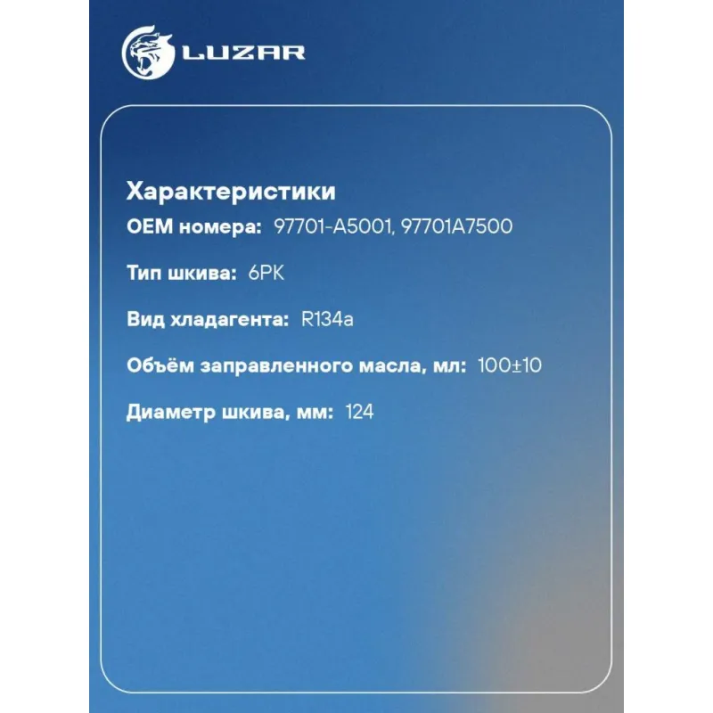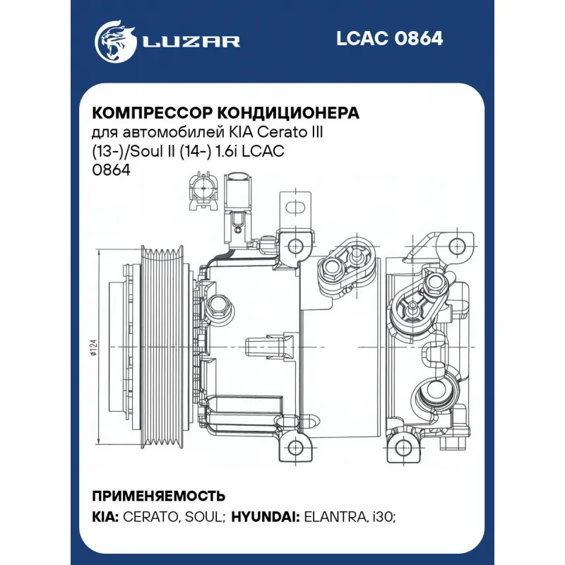Компрессор кондиционера для автомобилей KIA Cerato III (13-)/Soul II (14-) 1.6i Характеристики: Артикул: LCAC 0864 OEM номера: 97701-A5001, 97701A7500 Тип шкива: 6PK Вид хладагента: R134a Объём заправленного масла, мл: 100±10 Диаметр шкива, мм: 124 Сопутствующий товар: Радиаторы кондиционера (конденсеры): LRAC 0819 Ид.№ компрессора: 6SEU14 Вид заправленного масла: PAG46 Количество на автомобиль: 1 Мощность, кВт: 3 Комплектация: Компрессор кондиционера Уплотнительные кольца - 2 шт Паспорт изделия Гарантия: от 1 года.