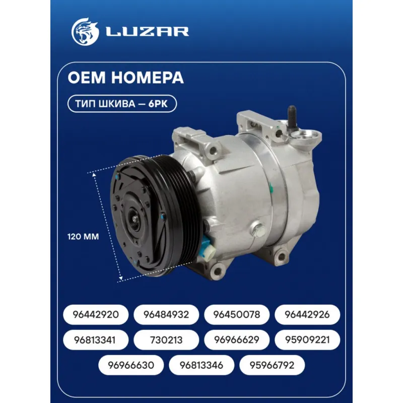 Компрессор кондиционера для автомобилей Lacetti (04-)/Cruze (09-) 1.4i/1.6i Характеристики: Артикул: LCAC 0578 OEM номера: 96442920, 96484932, 96450078, 96442926, 96813341, 730213, 96966629, 96966630, 95909221, 96813346, 95966792 Сопутствующий товар: Датчики давления хладагента: LRPS 0997 Сопутствующий товар: Муфты компрессоров: LMAC 0578 Количество на автомобиль: 1 Объём заправленного масла, мл: 200±15 Вид хладагента: R-134a Тип шкива: 6PK Диаметр шкива, мм: 120 Вид заправленного масла: PAG 46 Ид.№ компрессора: V5 Сопутствующий товар: Радиаторы кондиционера (конденсеры): LRAC 0578; LRAC 0581; LRAC 0589; LRAC 0550 Сопутствующий товар: Клапаны расширительные кондиционера (ТРВ): LTRV 0520; LTRV 0578 Сопутствующий товар: Ресиверы-осушители: LCR 0578 Сопутствующий товар: Управляющие клапаны: LCCV 0501 Сопутствующие товары:: 6PK1893, 6PK1873, CM 0503 Комплектующие компрессора: LCCV 0501, LMAC 0578 Мощность, кВт: 2,5 Подходит для авто: Chevrolet Aveo T250 (06-), Lacetti (02-), Cruze (09-), Aveo T200 (02-) Daewoo Nubira III (03-) Для проверки применяемости отправьте VIN автомобиля через вкладку "Есть вопросы о товаре?" Комплектация: Компрессор кондиционера Паспорт изделия Уплотнительные колечки - 2 шт Гарантия: от 1 года.